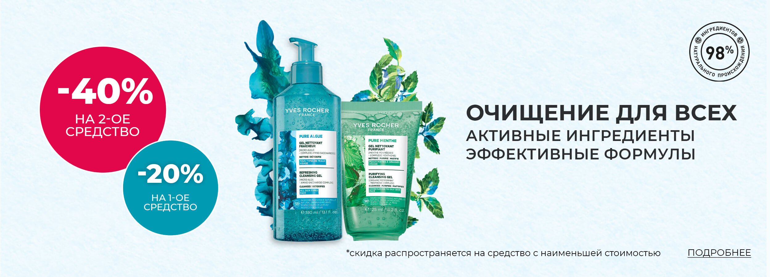С 1 по 31 марта в интернет-магазине и в магазинах фирменной сети Yves Rocher скидка 20% на выделенный ассортимент продуктов для очищения (при покупке одного продукта) и -40% на каждый последующий продукт из этого перечня.